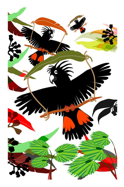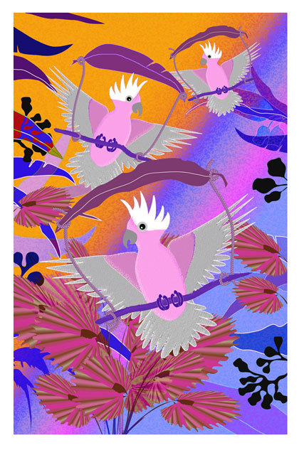 This artwork depicts Parrots perched on twigs and leaves paragliding.